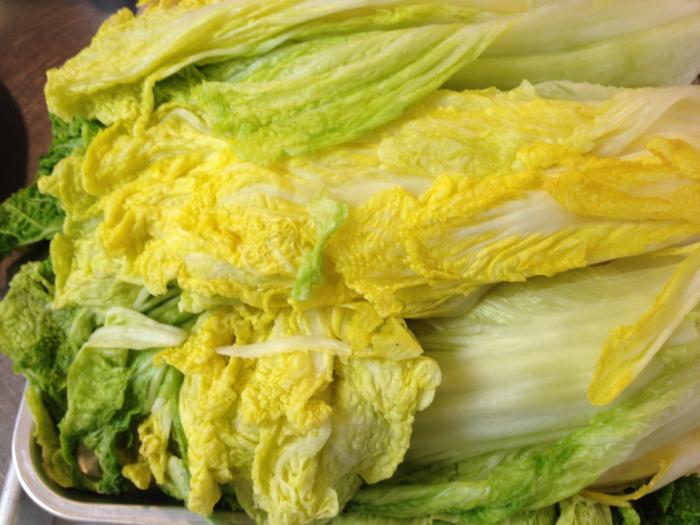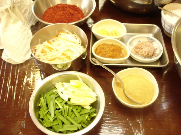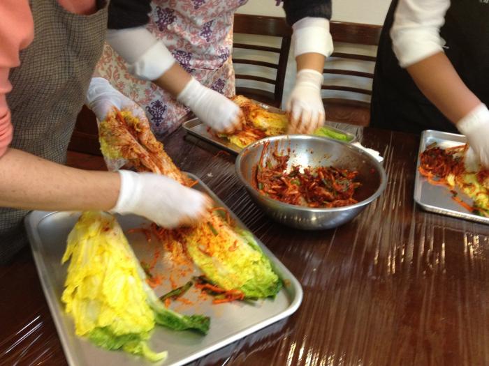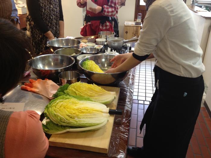 デモンストレーション後は実習です。グループでヤンニョムを作り、こちらで用意した塩漬け白菜を使ってキムチを作っていただきます。(お一人1/4株×2個=白菜半玉分。)作ったキムチはすべて持ち帰りです。